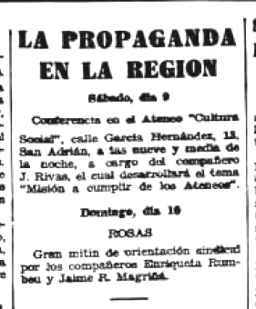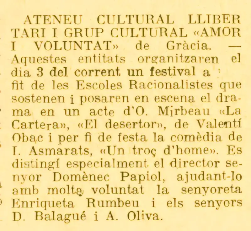Per tant, membre d’un Ateneu Llibertari i d’un dels grups que, en els nostres mitjans, formaven -en tots els sentits- i practicaven en la Idea. I, a més, en pro de les escoles racionalistes que sindicats, grups i ateneus, posaven dempeus.