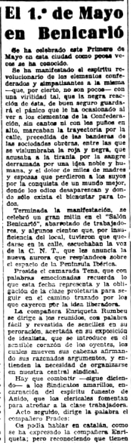 La trobem, després, a Solidaridad Obrera del 7 de maig de 1936. Surt dues vegades, una participant en un míting del Primer de Maig a Benicarló (València). De la noticia s’entén que Enriqueta és coneguda perquè només la presenten, sense explicar de quina federació o sindicat ve, que fa el míting en català i que pertany a la CNT perquè, en la seva al·locució, en parla de la necessitat obrera d’afiliar-se al sindicat.